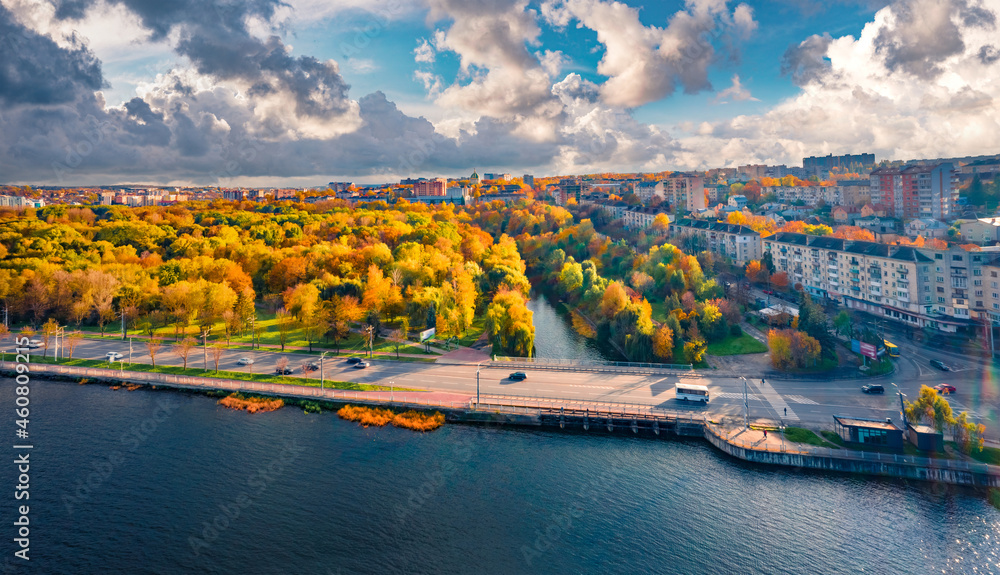 Dramatic Autumn Cityscape Of Ternopil Town Ukraine Europe Spectacular Morning View From Flying Drone Of Ternopil Lake Traveling Concept Background Stock Foto Adobe Stock